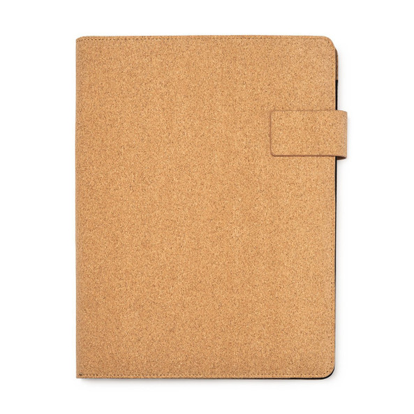 A4 portfolio in natural cork with magnetic closure. Includes pad of 30 lined, removable white sheets, 4 inside pockets and pen holder.