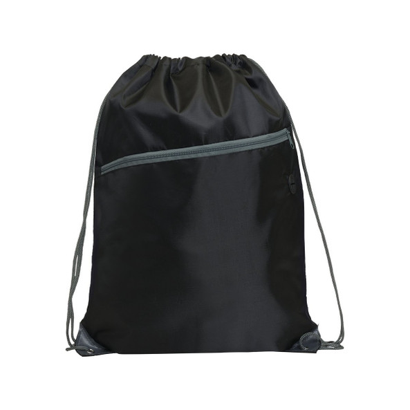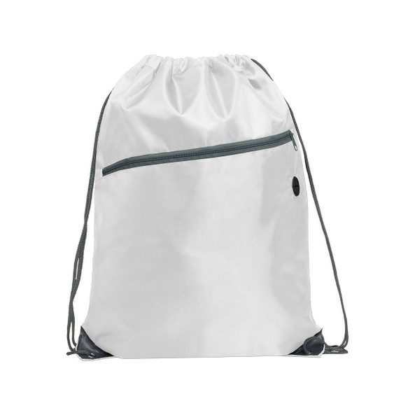 Drawstring backpack in 210D soft polyester, in cheerful and wide range of colors. With zippered front pocket and headphones output. Self closing strings in grey, matching color zipper, and corners with metal eyelets and PU leather reinforcement.