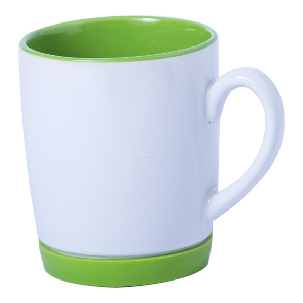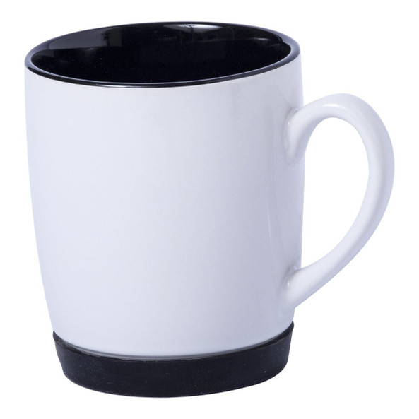 Ceramic mug with Silicone base. White exterior and colored interior. Capacity 300ml.
