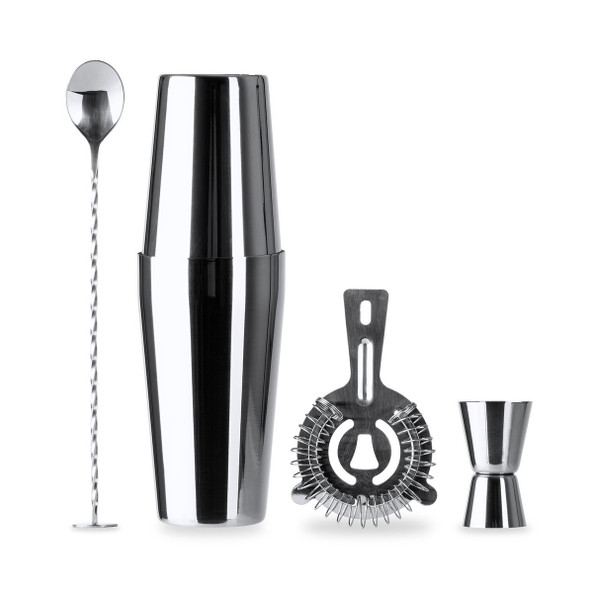 Cocktail set. Includes measuring cup, 580ml shaker, strainer and spoon. Supplied with pouch Presented in a single pack.