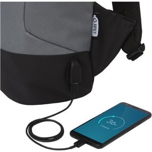 GRS certified backback featuring an open main compartment with organization panel, padded 15" laptop sleeve, and 2 RFID protection pockets. USB port on the right side to easily connect and charge devices from the interior. Comes with padded shoulder straps, right shoulder strap, hidden zipper pocket, grab handle, and a trolley pass-through. Approximately 15 plastic bottles are recycled to make this bag.