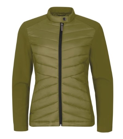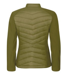 combination of quilted and softshell fabric, cut fitted by side parts, stand up collar with snap button, full-length coil zipper, side pockets with coil zipper, inner breast zip pocket , access for branding in back lining
