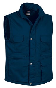 Multi-pocket work vest in sturdy cotton-polyester twill for durability and insulation. This functional vest offers exceptional storage and warmth. Designed for professional workwear and active outdoor use, it features a quilted inner lining and a stand-up collar with a full-zip flap for thermal protection. The adjustable waist with side snap buttons and elasticated armholes ensure a secure fit, while the extended tailpiece provides lumbar coverage and a large area for customization. With 11 specialized pockets including zippered and velcro closures, it provides secure storage for tools and personal items. For businesses, the inside back zip allows for easy marking via screen printing or embroidery, making it a top choice for bulk orders and uniforms.